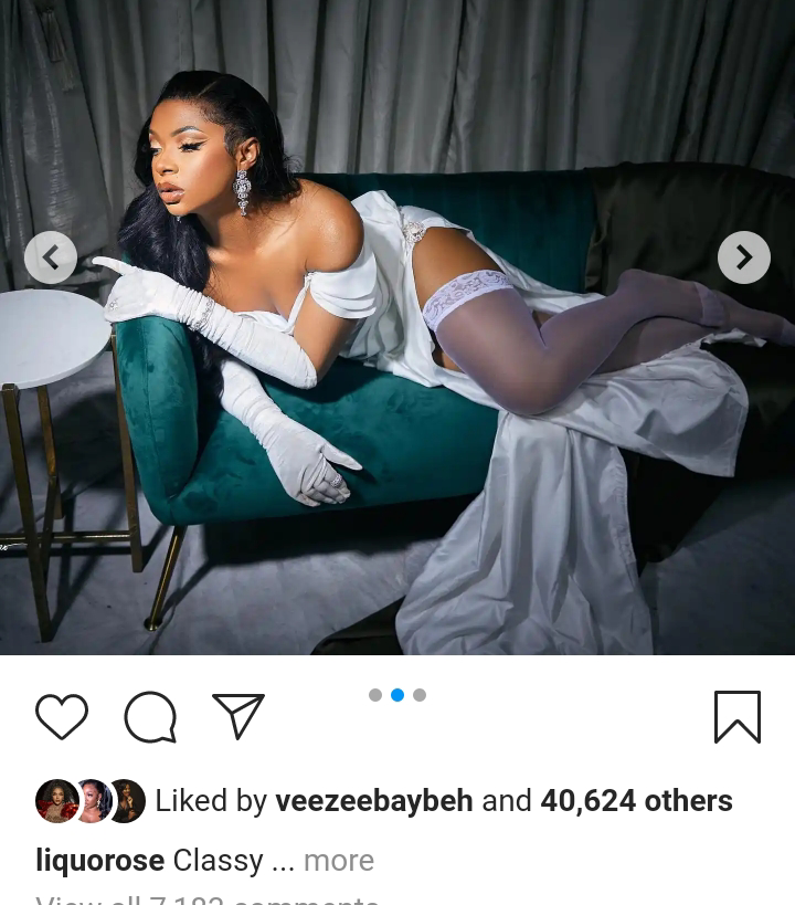 Liquorose is a darling, whose dress sense will always leave her fans marvelling on how she assembles her clothing to create such a huge appealing fashion craze in the mind of her followers, who are always in love with her wears and might want to emulate her, the Big Brother Naija reality star recently shared exotic images of herself wearing a very appealing dress which she termed '' Classy '' her dress was such a great source of attraction to her audience who are wowed by her appeal.
